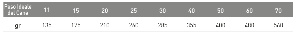 Istruzioni per l’uso: si raccomanda di richiedere il parere di un veterinario prima dell’uso. Somministrare i quantitativi indicati riportati in tabella in base al peso del cane, come unica fonte di cibo.
